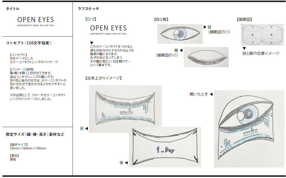 目は、カラーコンタクトレンズのカラーになっています。一目でわかるよう、片方は「目」とまつ毛、もう片方は実物に近づけ、目の上に開く瞼を制作しました。瞼を開けると、目が出てきます。全体の色合いは、肌の色味を感じられる、コスメの商品だと分かる色にしています。裏面の文字組は、パッケージの世界観を邪魔しないように配慮しました。