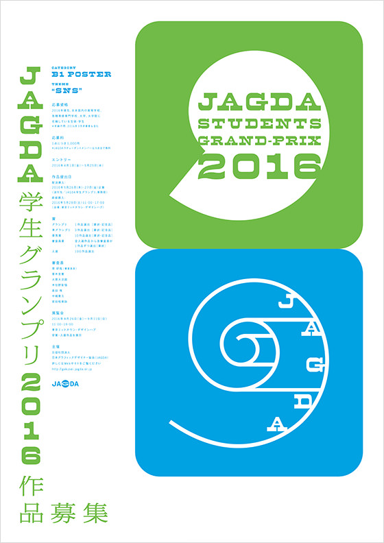 主催のJAGDAとは、1964年東京オリンピックポスターデザインなどで有名な故・亀倉雄策さんらを中心に1978年に設立された「公益社団法人日本グラフィックデザイナー協会」の略称です。約3,000名の会員を擁する日本で唯一のグラフィックデザイナーの全国組織です。JAGDAといえば亀倉雄策賞、JAGDA賞、JAGDA新人賞、JAGDAポスター大賞などのコンペが有名なんですが、去年10年ぶりに復活したのが、学生を対象としたポスターコンペティション「JAGDA学生グランプリ」。2016年の応募総数は810作品(累計983枚)。大学生や、3年制の専門学校生の応募の多い中、見事な受賞だったと思います。