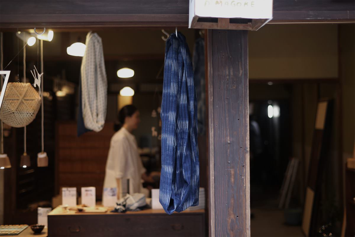外国人観光客によく質問されていた商品が、込山先生がデザインされた備後絣のストール「weather」。先染めで織られたモンペ素材に撥水加工をかけて、全天候型で便利に羽織れるストールだそうです。ブルーの色がキレイに映えますね!