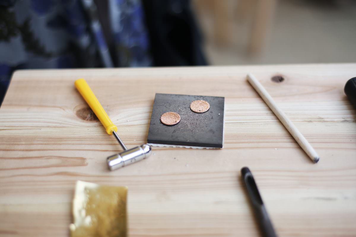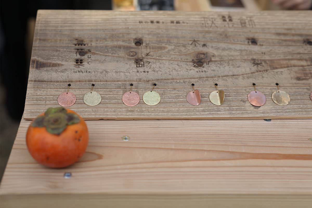 今回ナナメウエでは「金属を叩きたい!!」という学生の思いから生まれた、銅と真鍮のアクセサリーづくり「秋果飾」のワークショップをご用意しています。金属の叩き方によって仕上がる模様も様々。無花果/葡萄/木通/花梨の四種と…果実に見立てた模様を選び、工具とハンマーでガンガン叩いてもらいます。