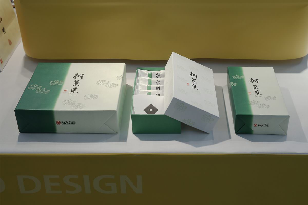 納島先生(写真右)もご自身の受賞も多く並んでいます。広島の誇るモチモチのあれ!やまだ屋さん「桐葉菓パッケージリニューアル」のお仕事。また安田女子大学書道学科の大学生さんとのコラボで生まれる久保田酒造さんのお酒でも受賞されています。