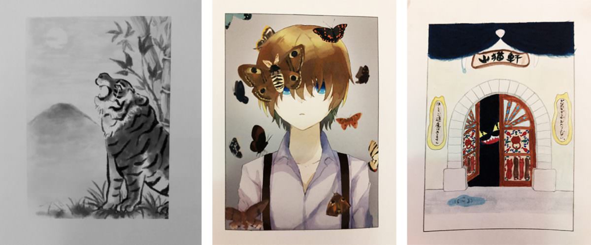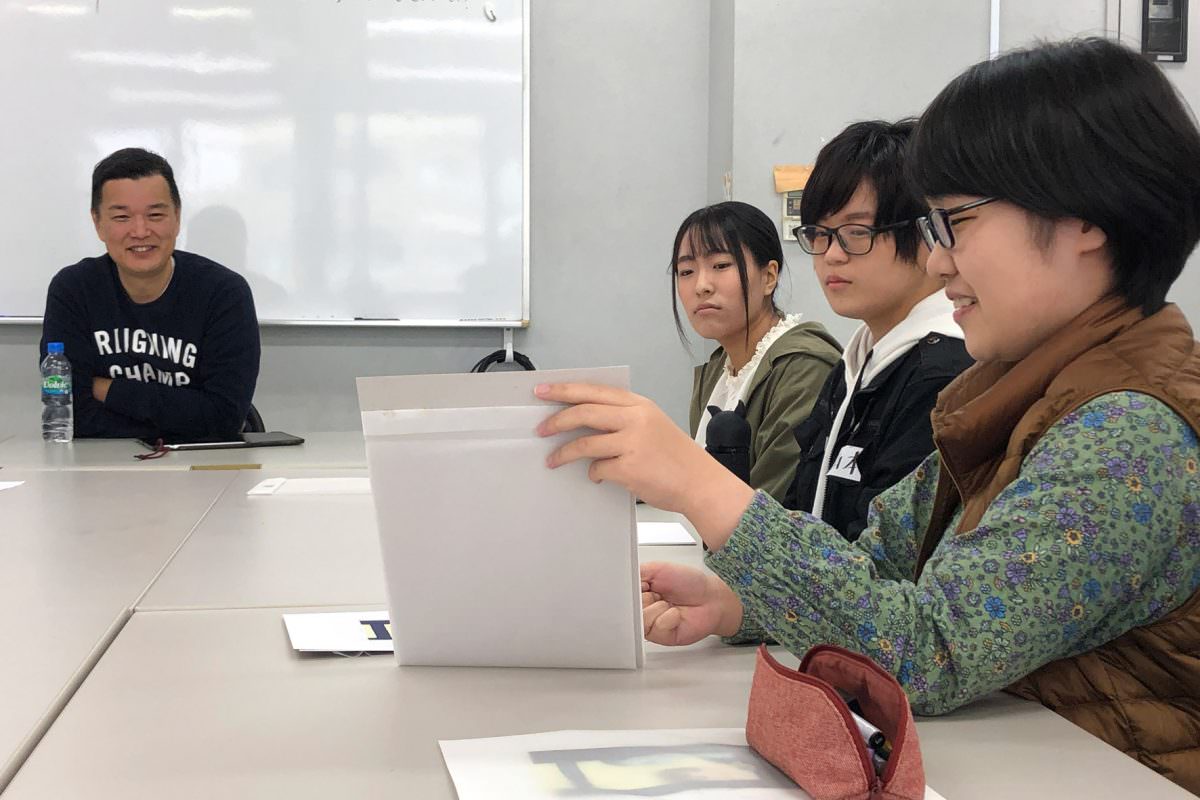 今日は、1か月前に出された課題の講評会でした。課題のテーマは「短い物語の本の装丁画を描いてみる」でした。学生たちは、それぞれが、中学や高校で勉強した物語をテーマにその物語本の表紙となるイラストを作成しました。