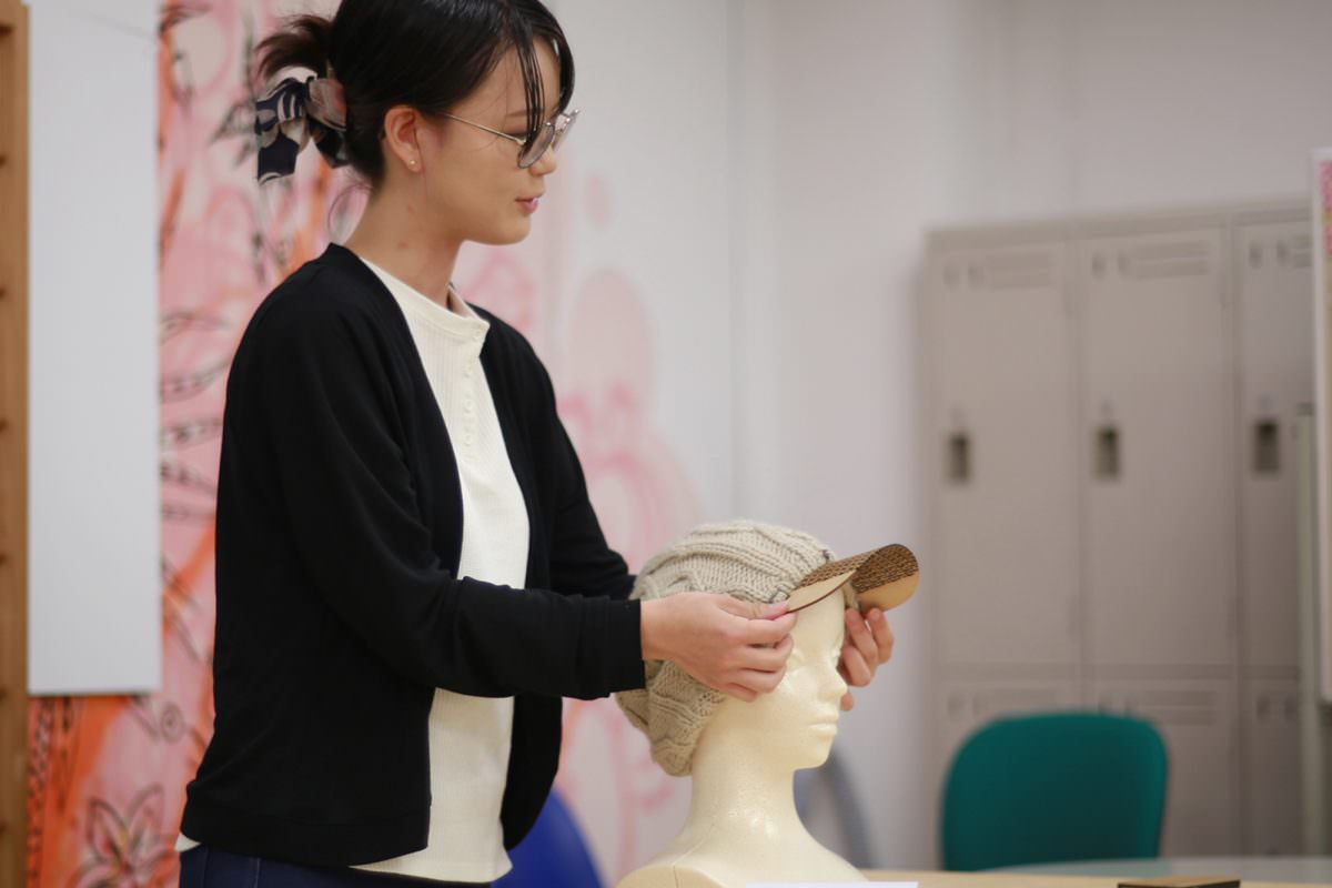 木材(MDF)を柔軟に曲げれる素材に変化させる切断方法を調べ、ニットをキャップにする企画。アイデアを実現するために、接続方法を模索するのにたくさん時間がかかったようです。