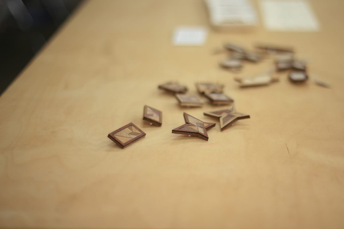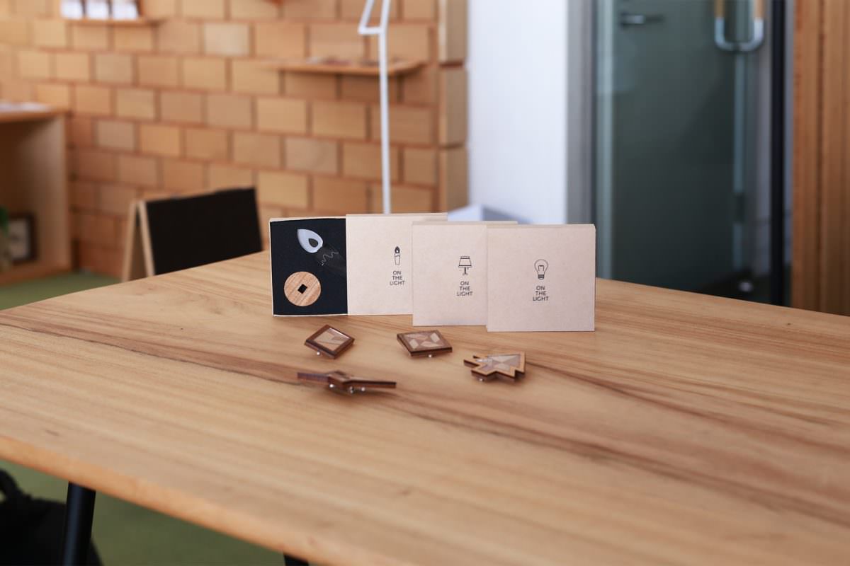 タングラムとブローチの融合。3cmほどのブローチに、色々な無垢材を切断したタングラムの図形を組み合わせていきます。自分で木製パーツを選びながらブローチをつくれる構造。ワークショップの体験と販売の両目線で買いたくなる仕掛けが考えられています。3mmほどの細かなパーツをつくったり組み立てたり、手仕事としてもしっかり仕上がっている作品で驚きです。