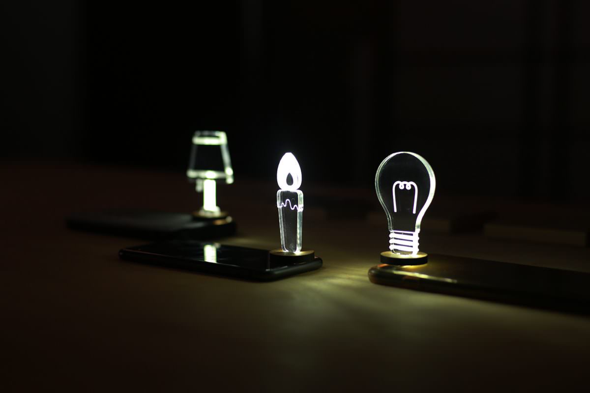 夜は「スマホを手放して本を読もう」をコンセプトにスマホを光源にした照明の企画。アクリルに光を通すと削り加工を施した箇所が乱反射して綺麗に光る原理を応用しているようです。でも削り加工を多用すると工賃が上がり原価が上がってしまうそうです。商品をつくるだけではなく、商品を理解してもらうためのポップ、説明書、値付など…お客さんに商品が届くまでにまだまだ考えないといけないことが山積みとのこと。