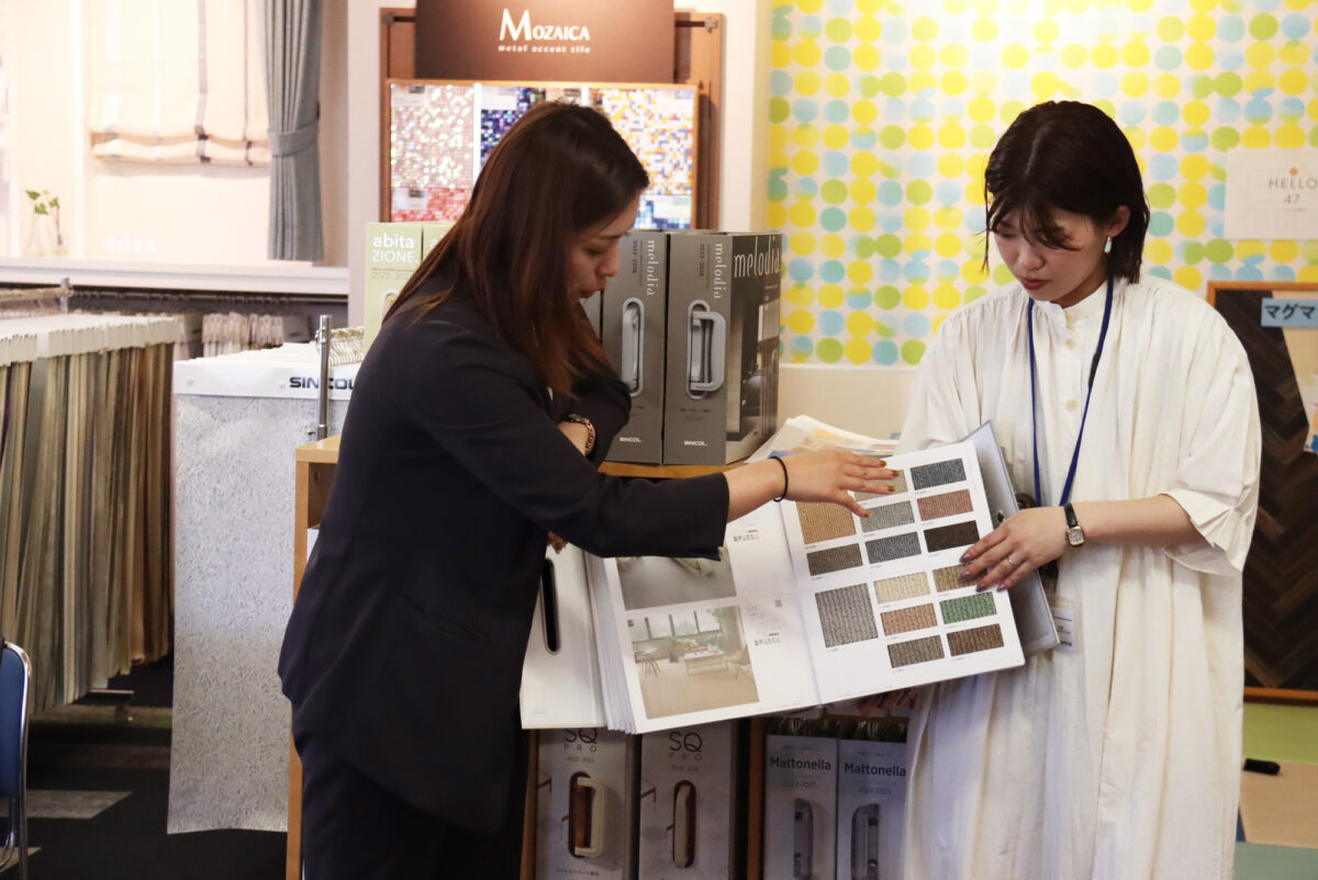 実際に手に取り素材の質感を見ながら、それぞれが思い描くイメージ合った商材を見極めます。