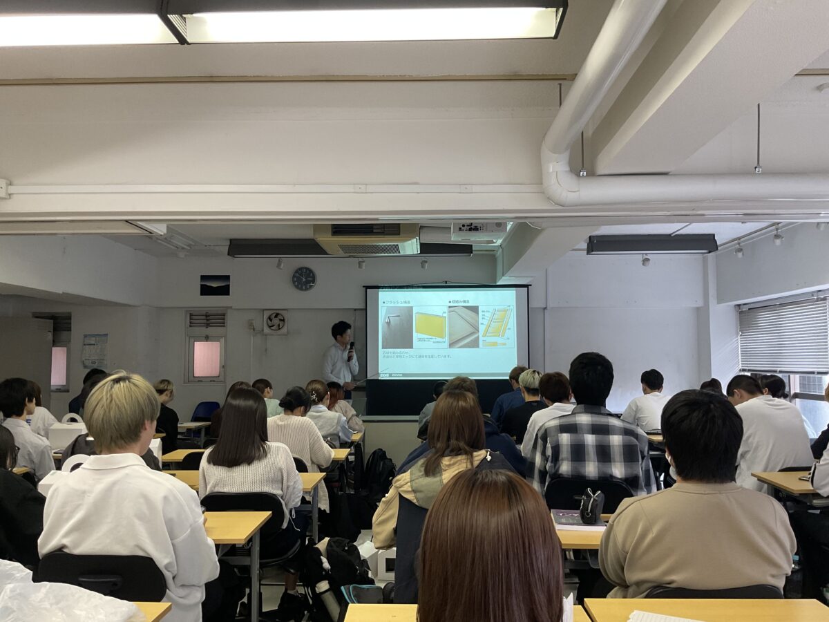 建築学科1年・インテリアデザイン学科1年の合同授業にて、床材・建具(開口部に使うドアや窓などのこと)を扱っている企業様にご協力いただき、実際に商品に触れてそれぞれの違いや特徴を知ってもらいました。
