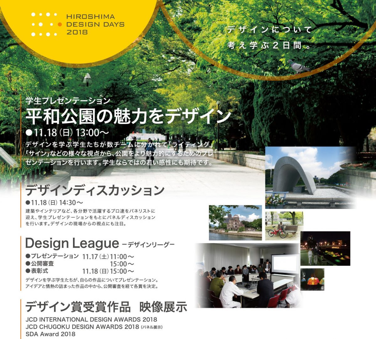 建築学科、インテリアデザイン学科の在校生4名が、「広島デザインデイズ2018」での学生プレゼンテーションに参加し、他校の学生さんとチームを組んでの平和公園のデザイン提案を行います。