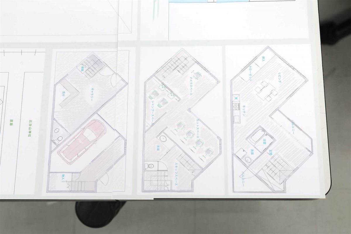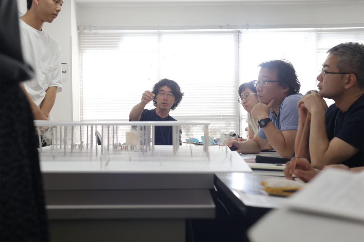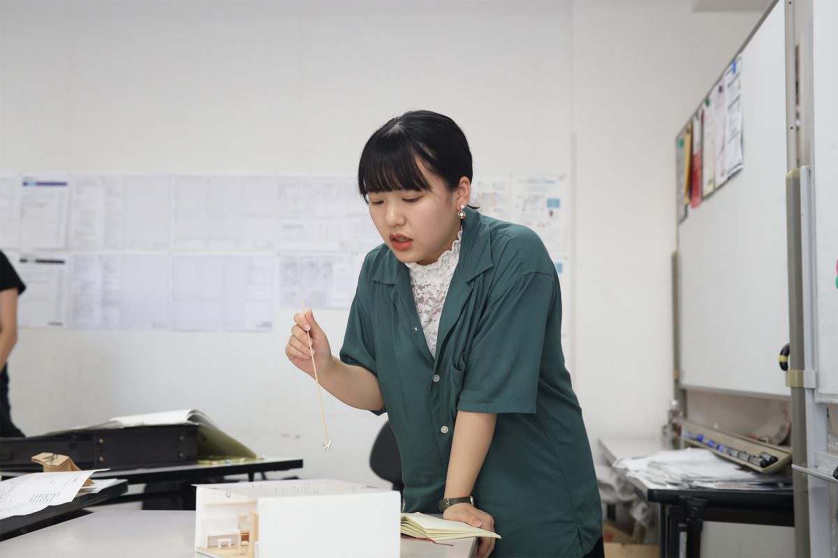 先日、建築学科とインテリアデザイン学科が集まる校内プレゼンテーションがあると聞き様子をうかがいに行ってまいりました。「猫との共存」や「神社近隣の美容院」「広島城敷地内の美術館」など、お施主さんからのご依頼に近いテーマを元に提案をするという課題となっているようです。講師陣に自分のアイデアを解説するために紙面や模型を使いプレゼンテーションを行います。上の写真は猫が歩ける棚を取り付けたインテリアの解説を模型と猫スティックを巧みに使って説明している風景です。