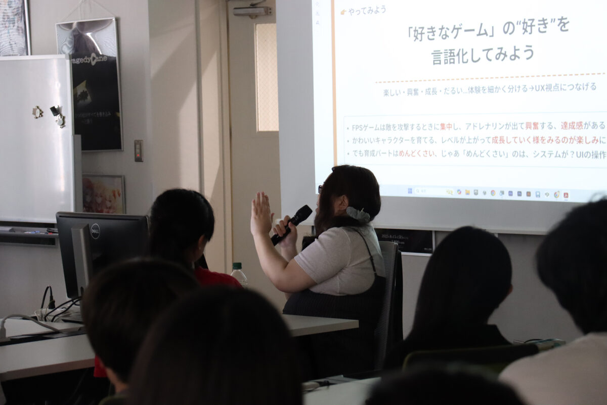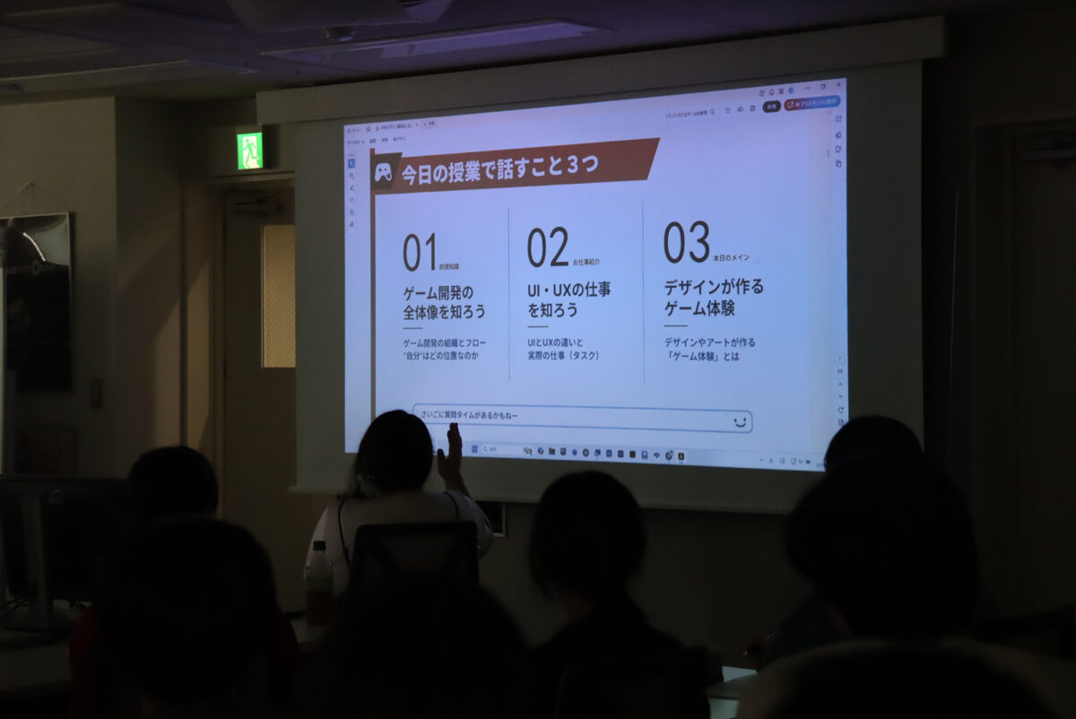 UIやUXについて、具体的なゲーム作品を例に出しながら、学生たちに分かりやすく説明してくださいました。
