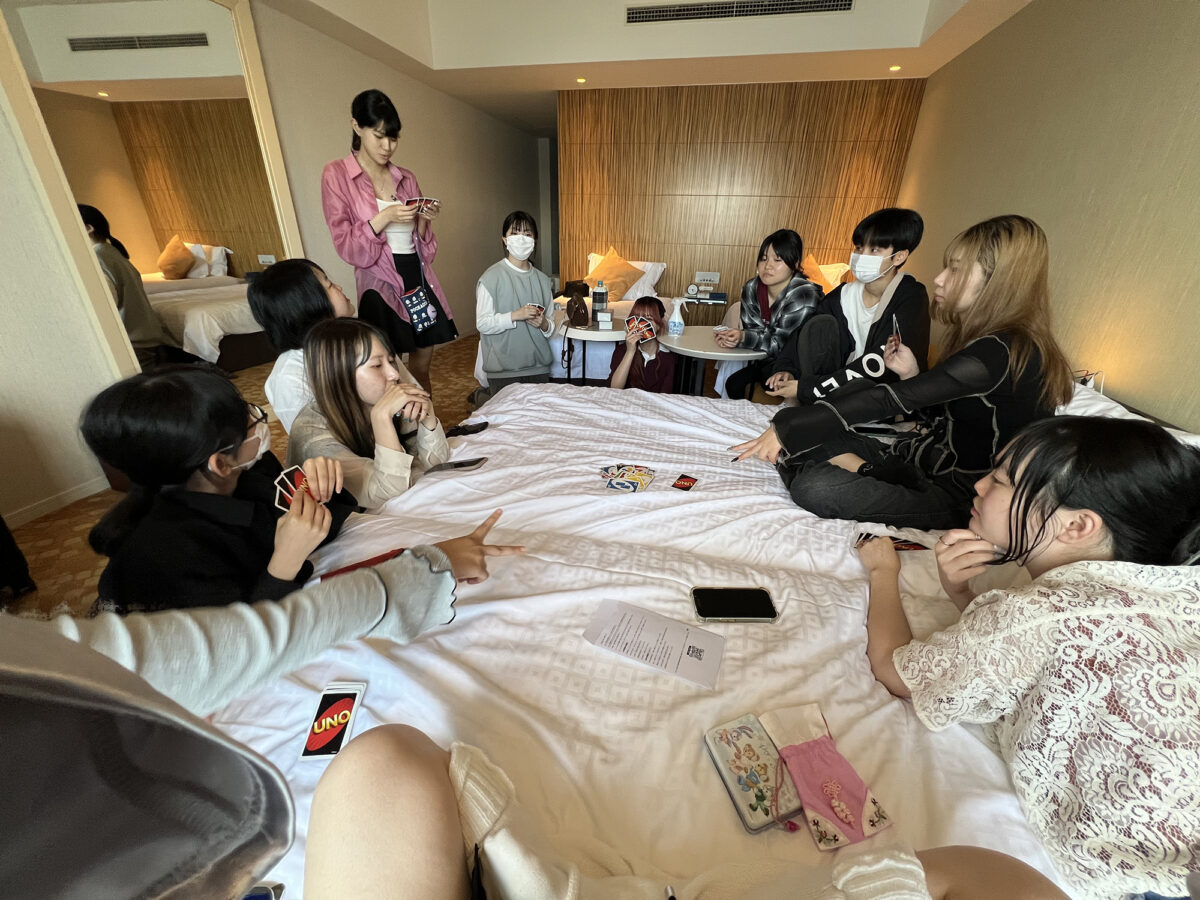 ホテルでは部屋に集まってゲームを楽しんだり、仲良く語り合ったりと、旅先ならではの特別な夜を満喫しました!