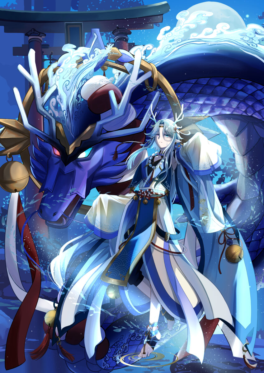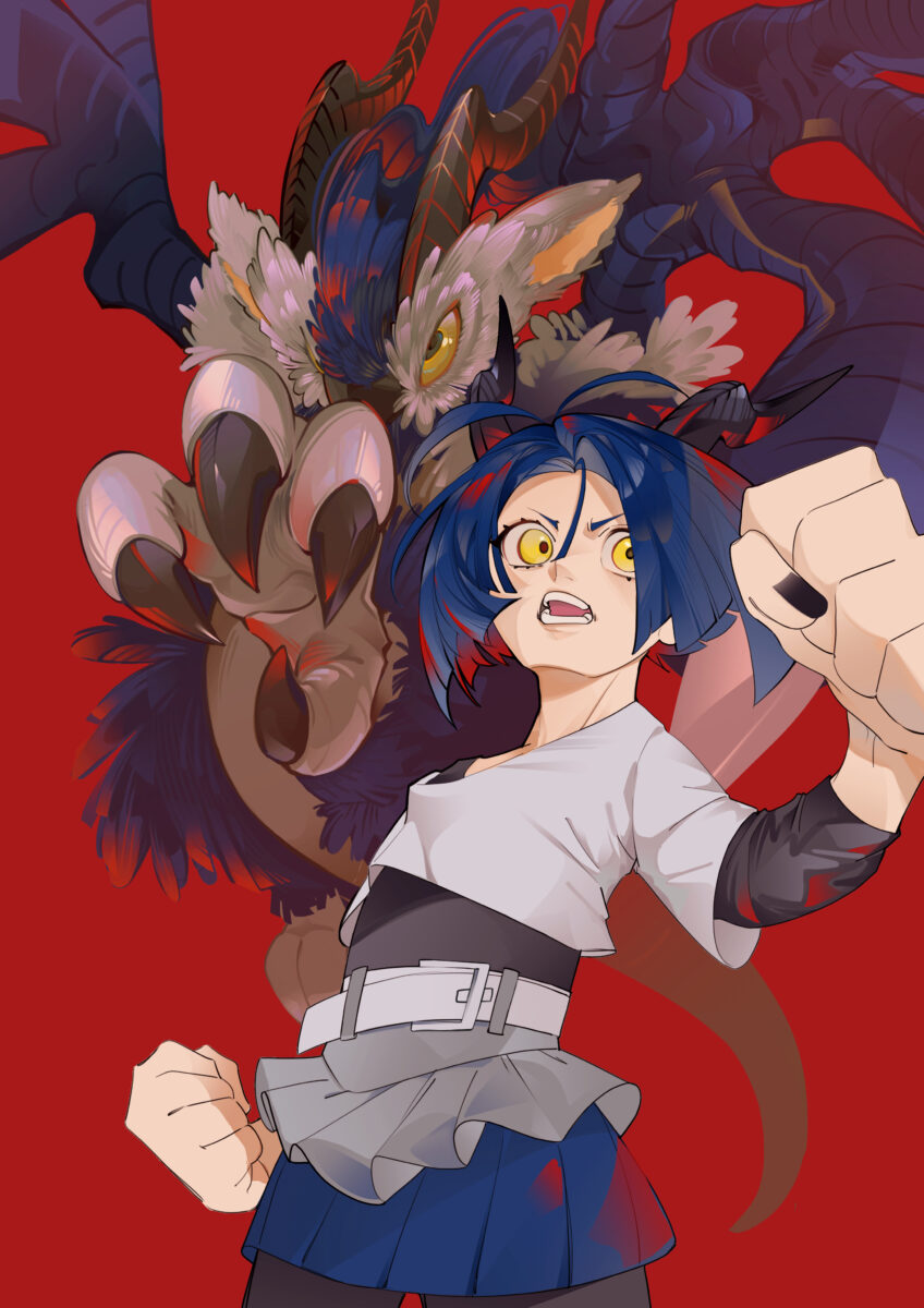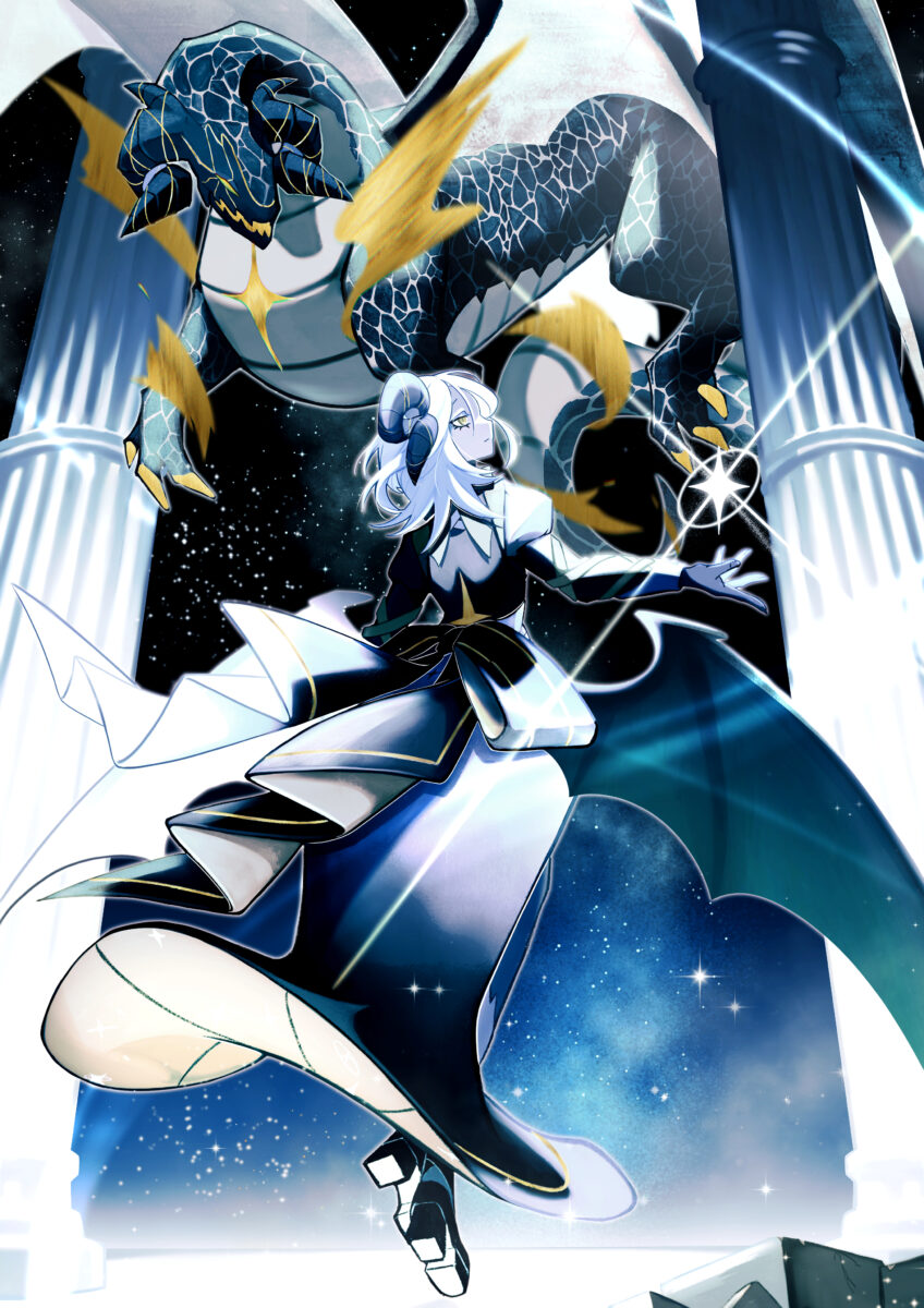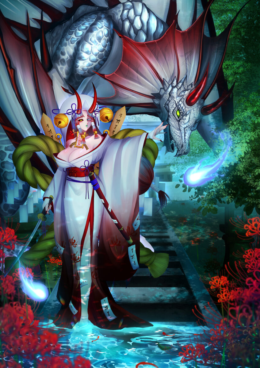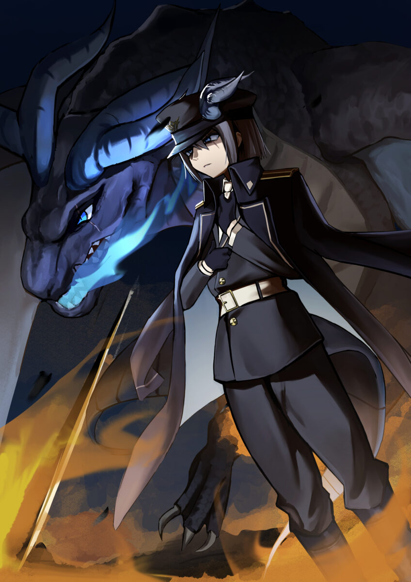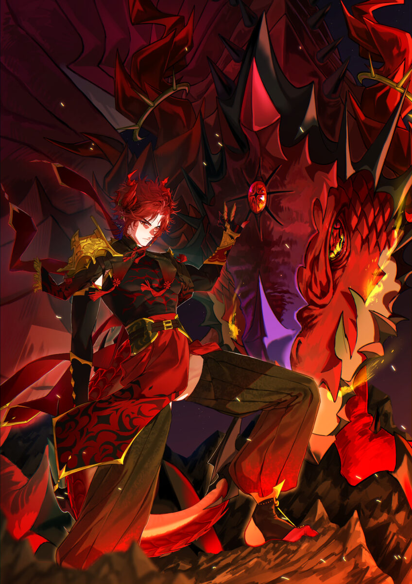 ①変身後のドラゴンが背後にいるキャラのイラスト 背景有