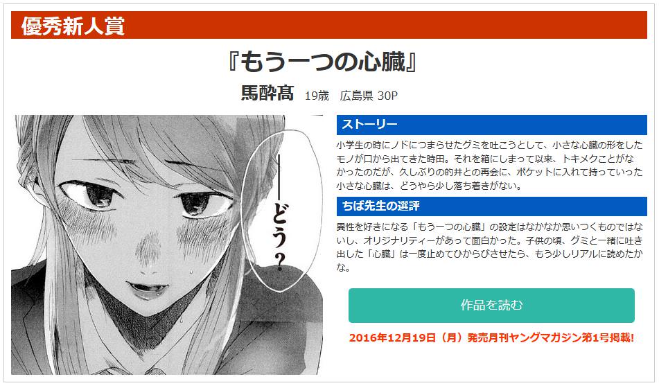 昨年の11月に講談社ヤングマガジン主催第75回ちばてつや賞にて優秀新人賞を獲得した、PN.馬酔髙(あせび・たか)さんの受賞作品「もう一つの心臓」が月刊ヤングマガジンに掲載されました。30ページの読み切り作品です。学生時代に作品掲載は非常に貴重なケースですが、馬酔さんにとっても作品掲載デビューとなりました。