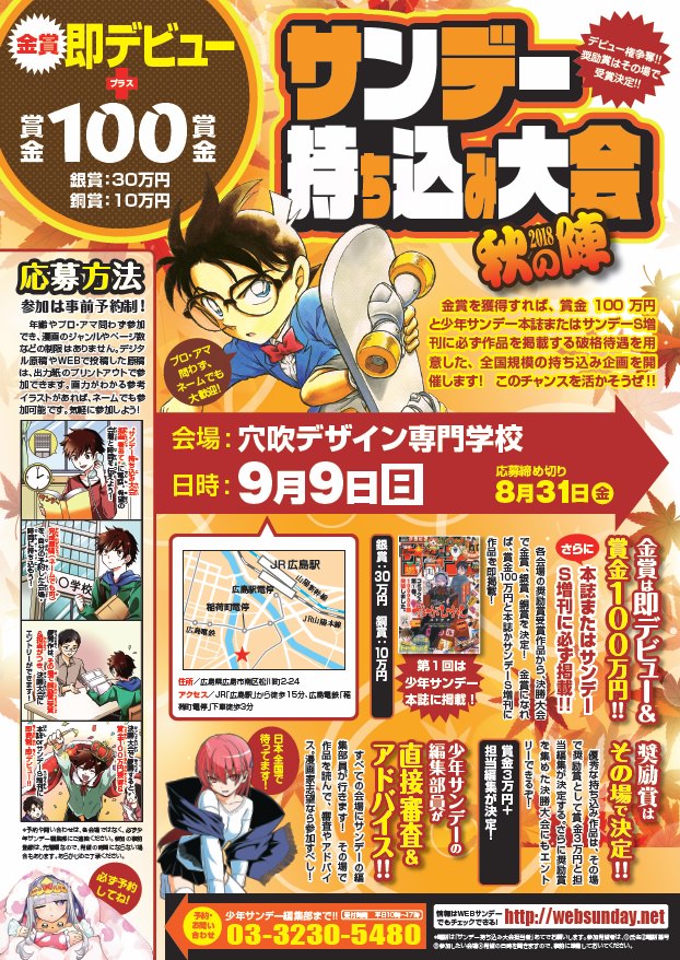 2018年9月9日(日)小学館少年サンデー編集部による「持ち込み大会2018秋の陣」が開催されます。9月に全国各都市をツアー開催されるなかで、広島会場は穴吹デザイン専門学校で開催が決定!各会場の奨励賞受賞作品から決勝大会が行われ、金賞を獲得すれば100万円の賞金+週刊少年サンデーかサンデーS増刊に掲載が約束されます。いわばデビューまでの道が保証される大チャンスです!
