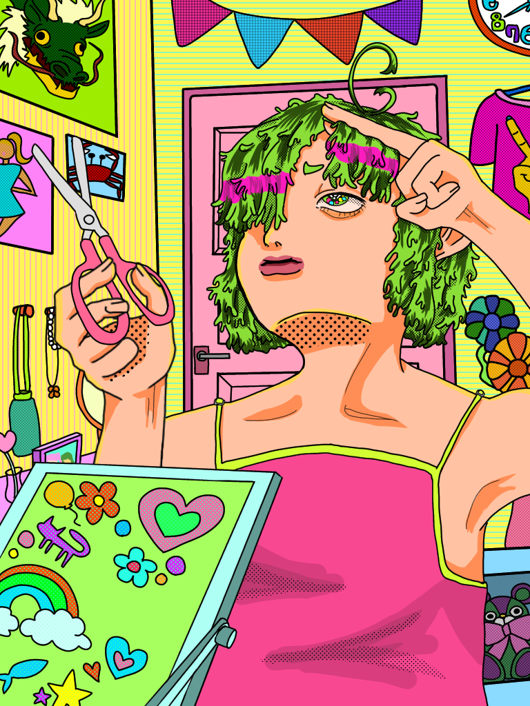 前髪を切る時に、ガイドの線があったらいいのにという気持ちを込めた作品です。