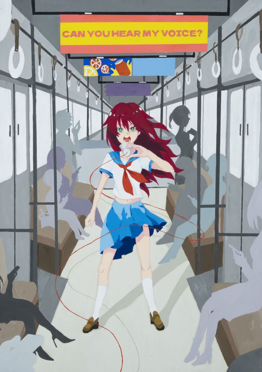 電車に乗った時、誰かが下を向いてスマートフォンをいじり、会話をする時も適当なあいづちを打つ人が多いなと思い描きました。「ネット上でのつながりばかり気にして、近くにいる人との会話が疎かになっていませんか?」糸電話からのびる赤い“ライン”が語りかけています。