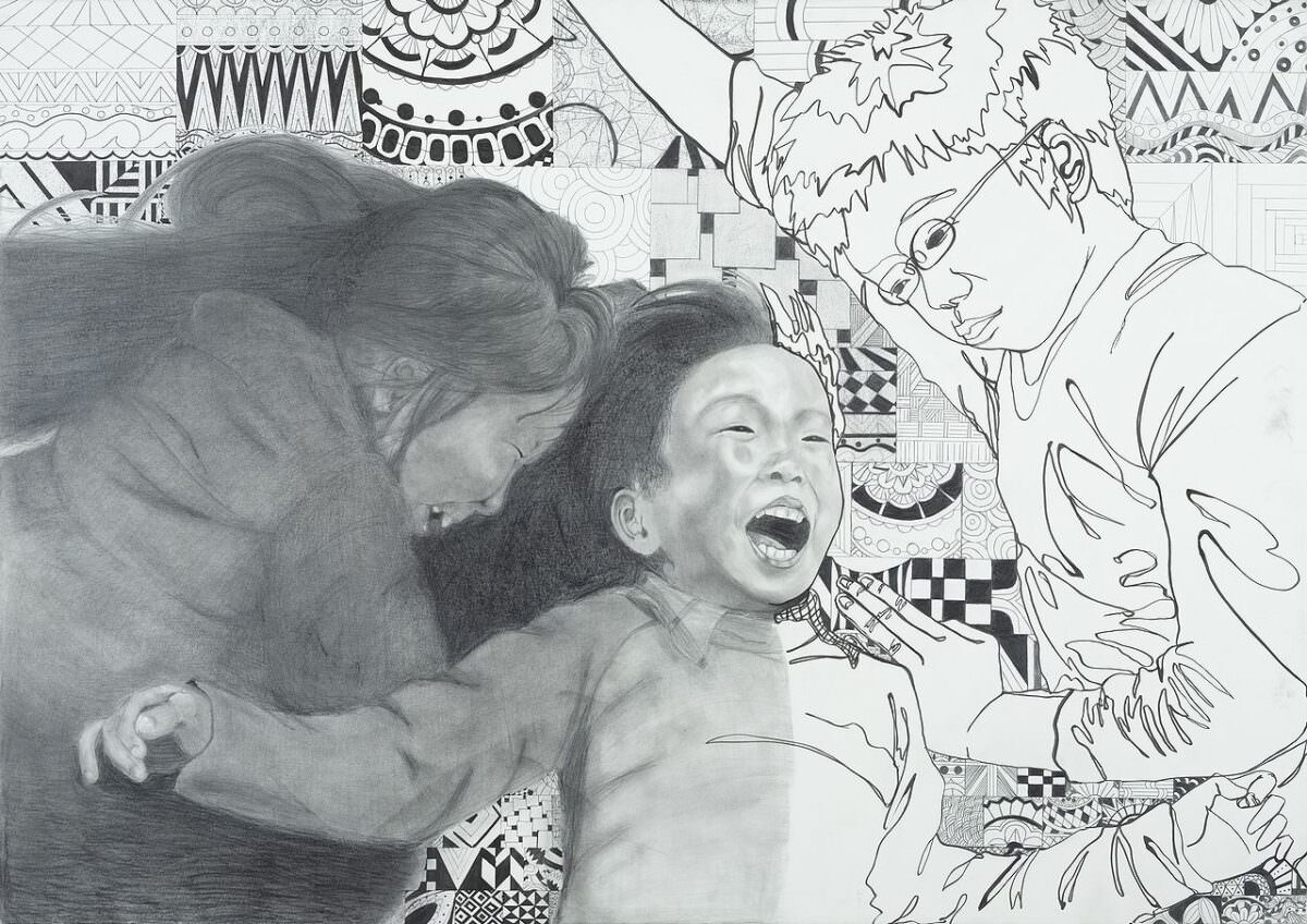 ペンの硬い線ではなく、鉛筆の柔らかい線で描きました。布や髪、皮膚の質感や色合いを一番頑張って描きました。