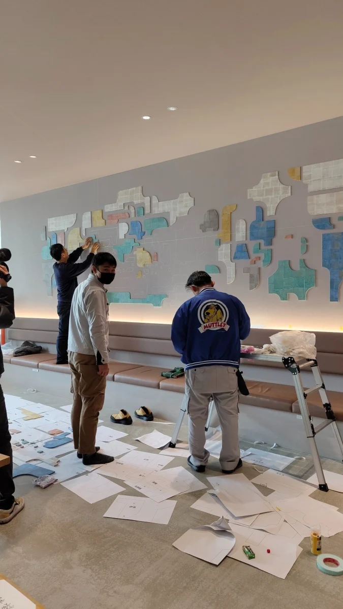 奥のソファの上に立ってまさに貼り付けているのが関浦先生