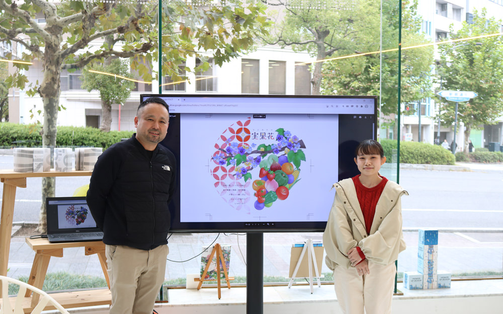 果青園SAWADAさんから、オリジナルギフト商品「実果花(ハナカジツ)」のロゴとキービジュアルのデザインの依頼があり、グラフィックデザイン学科の胡さんの作品が選ばれました。