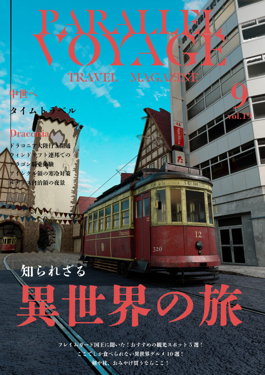 現実と異世界を繋ぐ道を制作しました。ケーブルカーをメインに配置して、旅行雑誌風のデザインを目標としました。