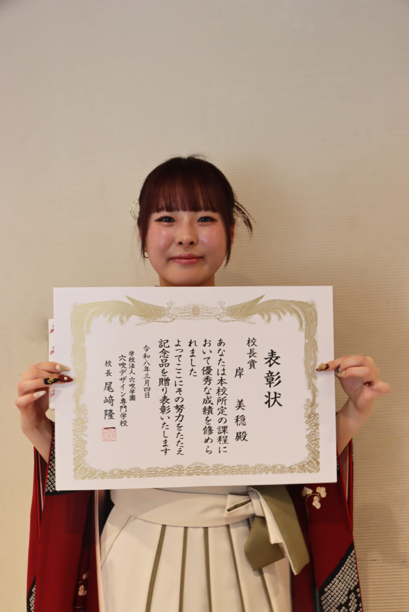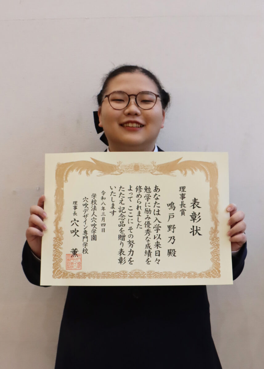 優秀な成績を修めた学生として、理事長賞がマンガ・アニメーション学科の鳴戸 野乃さん、校長賞がネット動画クリエイター学科の岸 美穏さんに贈られました。