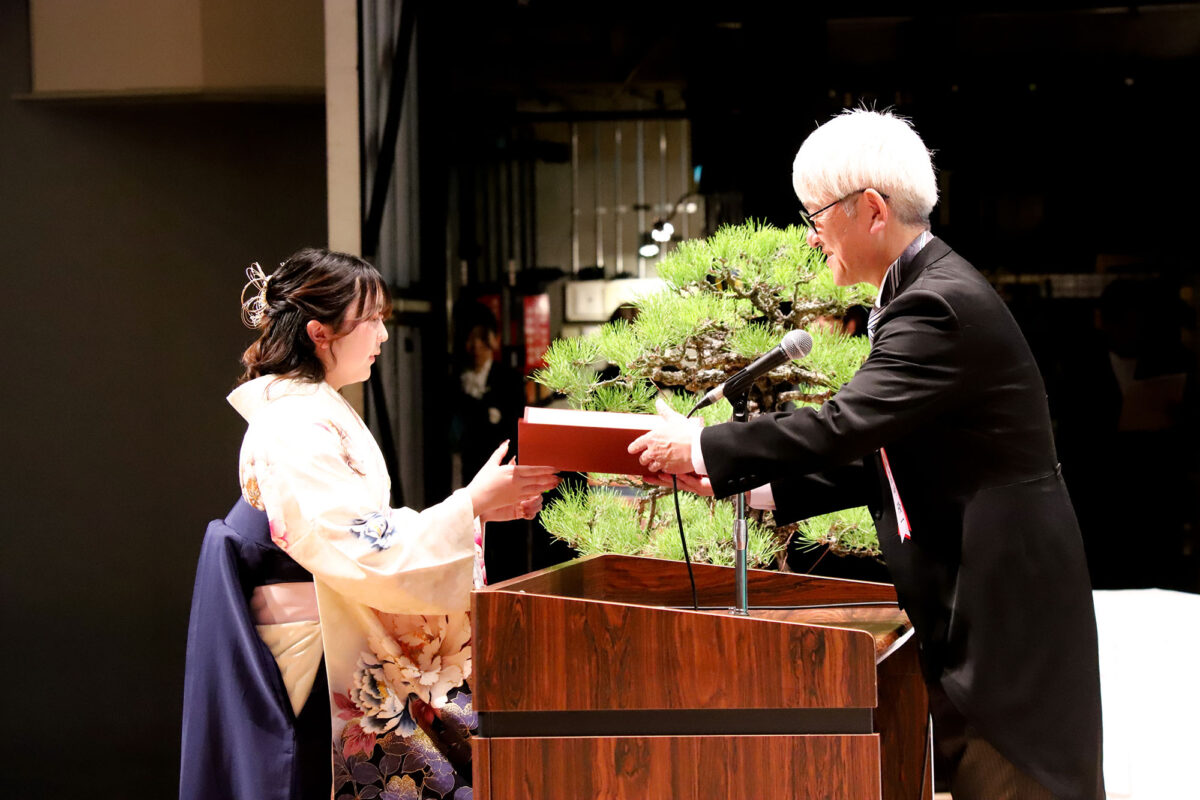 卒業生代表として、インテリアデザイン学科の今中 萌々香さんに、卒業証書が授与されました。
