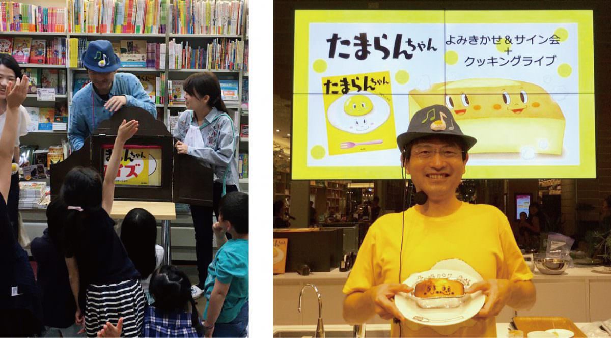 穴吹の学生時代からイラストレーターになりたくて、いろいろなコンペに応募していました。在学中に賞を取ったことがきっかけで、音楽雑誌でイラストを連載することに。初めて自分のイラストが載った雑誌を手に取って見た時の喜びはとても大きなものでした。その後、広島のデザイン会社に就職。5年間デザインの仕事で多くの経験を積みながら、イラストレーターになる夢を叶える為に上京。東京でイラストや絵本を学べるスクールに通いつつ、出版社やデザイン会社にイラストの売り込みをする日々でした。ですが、なかなか思うようにはいかず、資金も尽きかけ夢をあきらめかけた時期がありました。そんな頃に応募した絵本のコンペで賞を受賞。その受賞をきっかけに、どんな状況にあっても子どもたちに楽しんでもらえる絵本を作り続けようと決意。絵本作家としてデビュー作になる『たまらんちゃん』はアイデアの着想から出版まで7年の月日がかかりました。2作目となる『いもむしパン』では、絵本に出てくるパンをパン屋さんに実際に作ってもらったりと、絵本から広がるコラボも楽しみつつ創作に取り組んでいます。今では、自分の絵本を読み聞かせした時の子どもたちの笑顔を見るのが一番の幸せです。