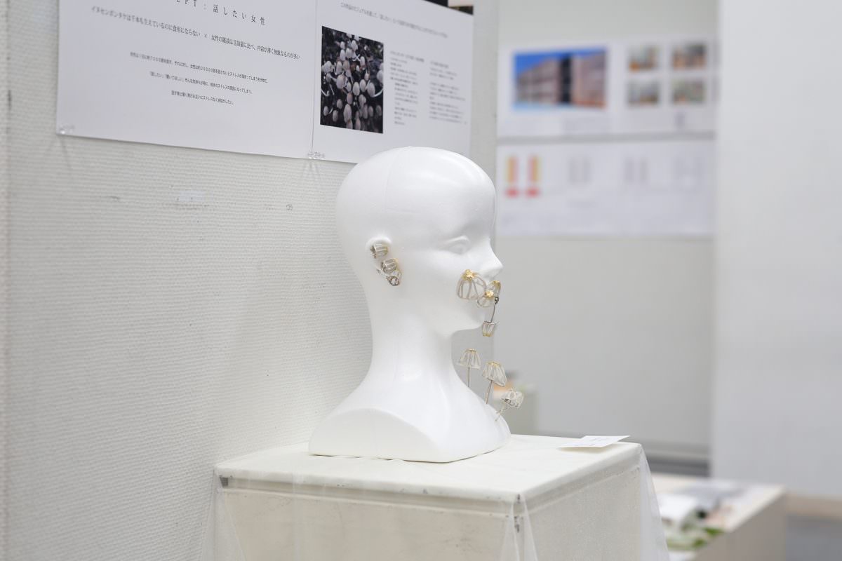 卒業制作では、犬千本茸をテーマにしたアクセサリーの作品を作っています。名前の通りたくさん生えるのに、食用に向かない(犬も食わない)キノコだそうで、それが私の中で無駄なキノコという印象がありました。女性は男性の3倍しゃべる生き物だそうですが、無駄なキノコのイメージが女性の雑談とマッチするなと考えて、しゃべりたい時に生えてくるキノコということで、キノコでインプットとアウトプットを表現しました。実用的なアクセサリーではなく、作品として見てもらえたらと思っています。