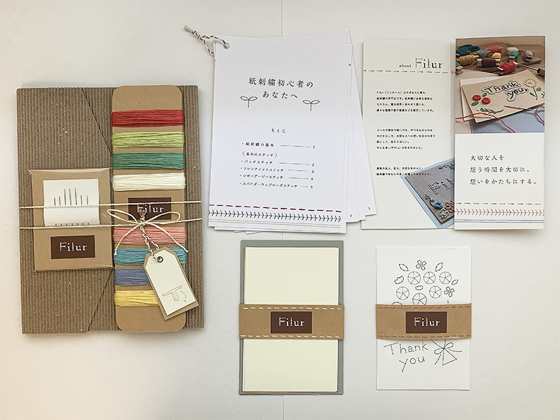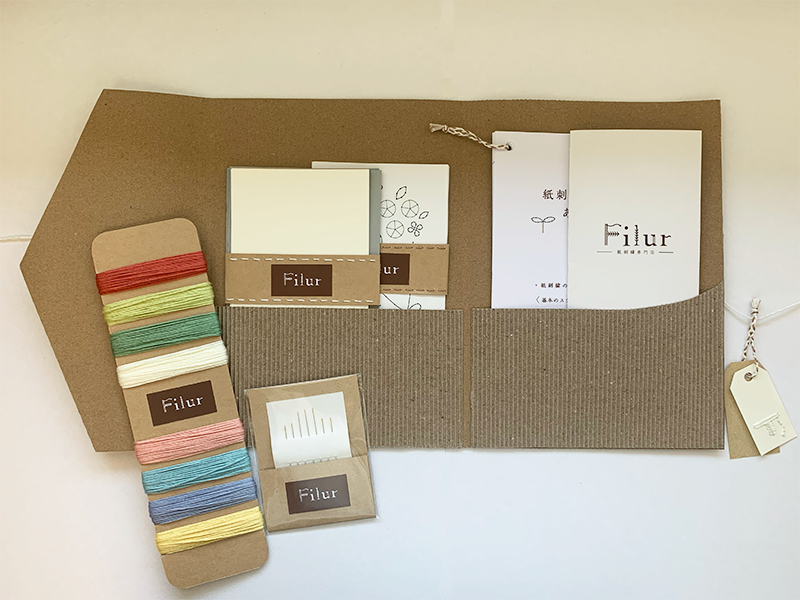 キットにはショップのリーフレット、説明書、紙刺繍用の紙、刺繍糸、図案が入っており、紙刺繍をしたことがない人でも楽しんでいただけるようになっています。