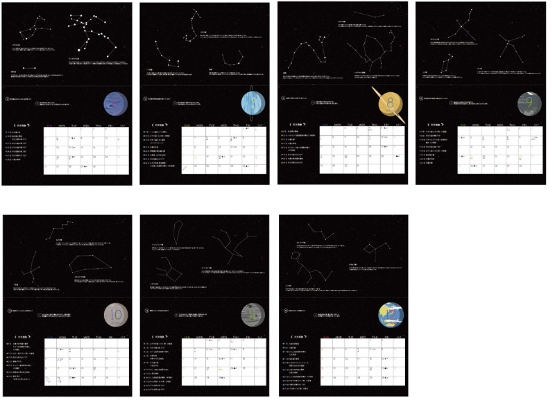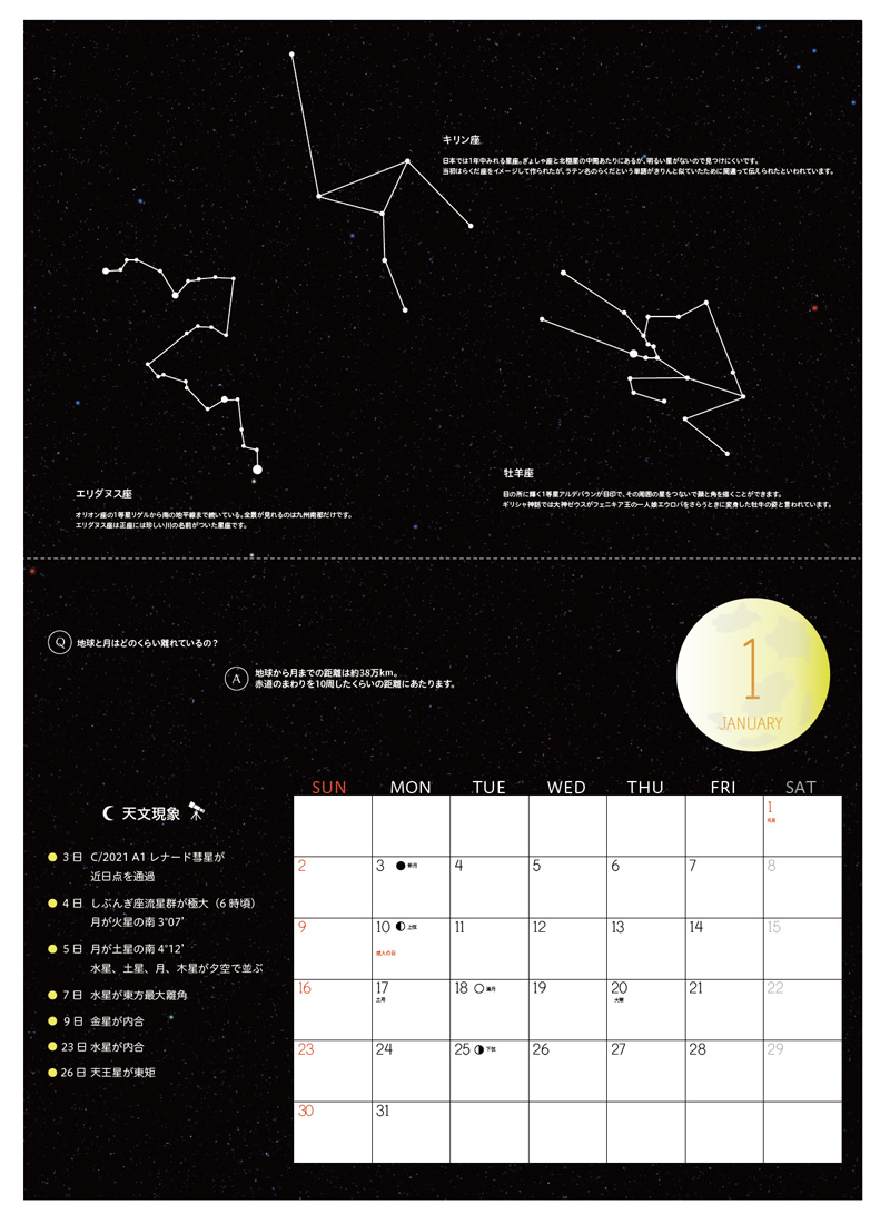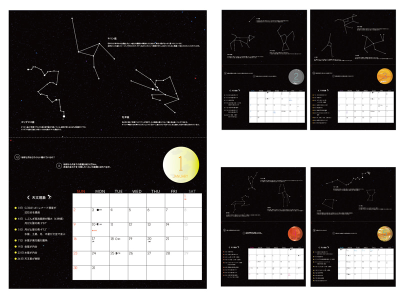 カレンダー上部にはその季節・月に見える星座を3つチョイスし、説明や簡単な見つけ方を載せました。下半分は毎月、宇宙Q&Aと天文現象を載せています。
