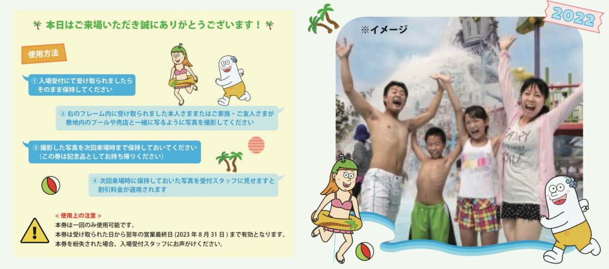 この券はフォトフレーム型になっており、来場者本人または同行者がフレームの枠内に入るように写真を撮影した後次回来場時まで保存し、その保存しておいた写真を次回来場時に受付スタッフに見せることで、入場料金が割引されるという仕組みです。