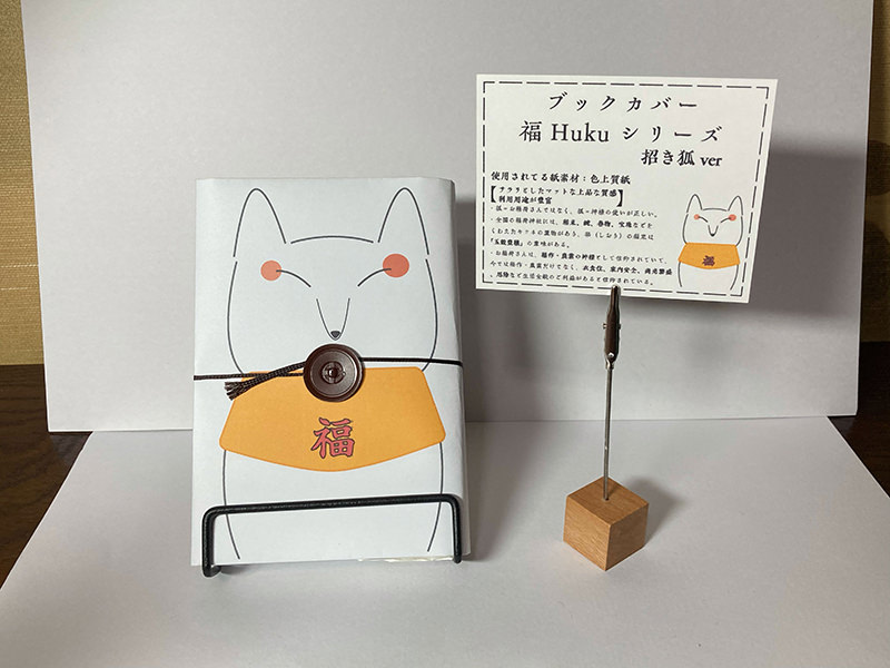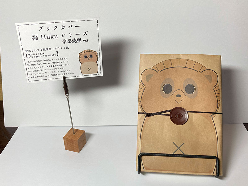 この作品のコンセプトは“幸せを巡るブックカバー”です。コンセプトの由来は、このカバーを使う方々に幸せがやって来て、その幸せがさらにたくさんの方々に行き渡り幸せが巡り巡ることです。制作した作品は、紙製ブックカバー三冊、栞六枚(一冊につき二枚)、ポップ三つです。カバーのイラストは招き猫と信楽焼狸、招き狐の三つで、これらは幸せを招く置物として有名なものです。