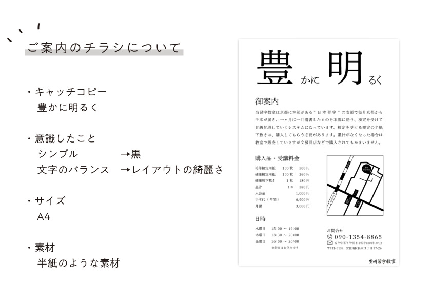 習字のイメージとして""シンプル""や""文字のバランス""などを表現しようと思ったので、使用する色を黒に限定して文字の大きさやレイアウトの綺麗さを意識して制作しました。