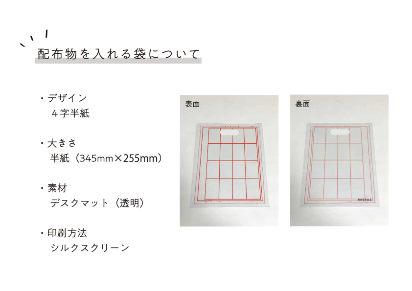 袋は実際に習字教室で使われている4字半紙のデザインを使い作成しました。