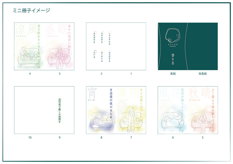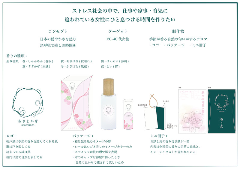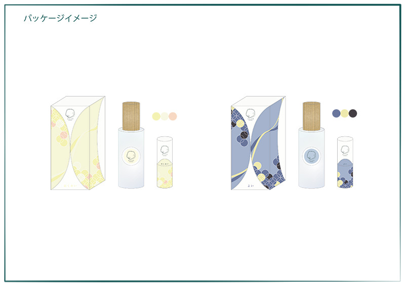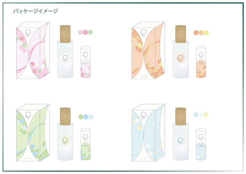 コンセプトは「日本の穏やかさを感じ深呼吸で癒しの時間を」です。ストレス社会の中で、仕事や家事・育児に 追われている女性にひと息つける時間を作りたいという想いを込めて制作しました。パッケージの箱は後ろから包み込む感じを表現した形で、デザインは波線で風を表現し円形の集合体で和柄風に、香りの色ごとで花や葉、雪などのイメージに変わるようになっています。ゆるく落ち着いた感じにしたかったので全体的に丸を意識しています。