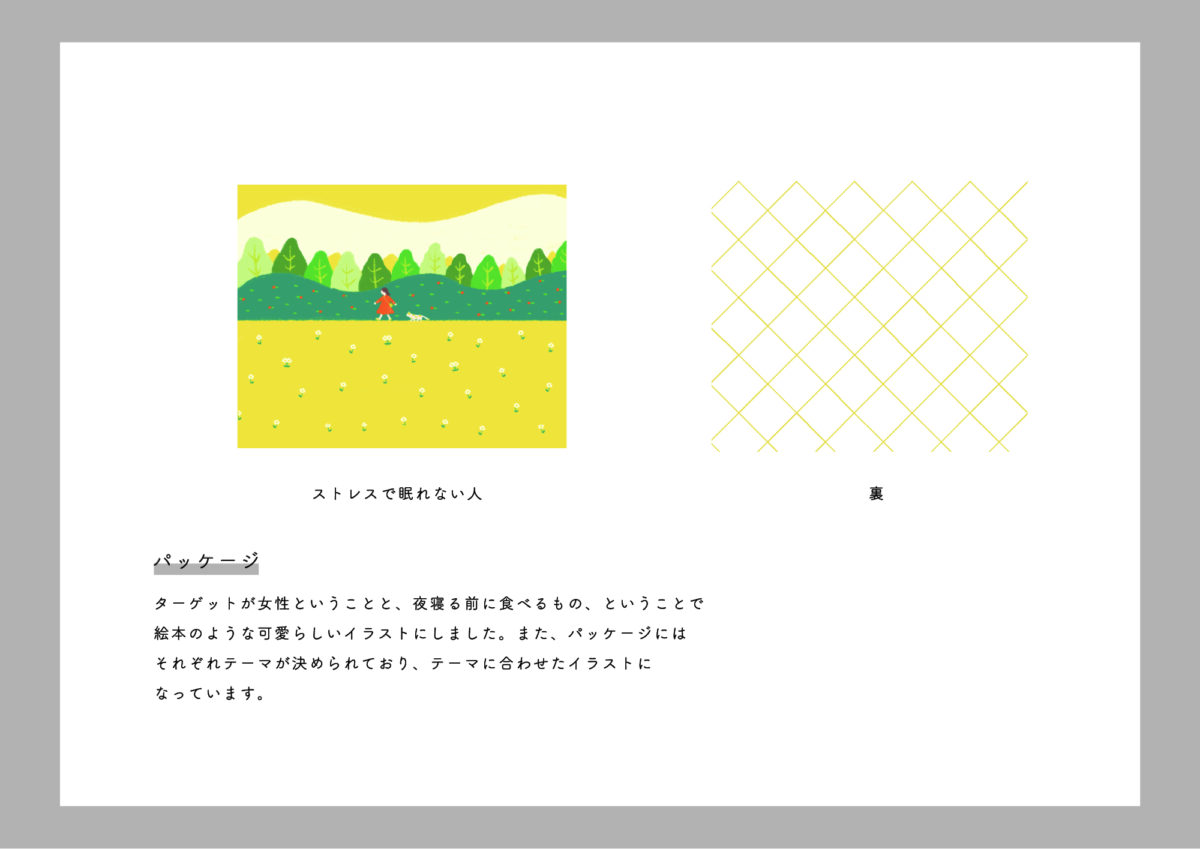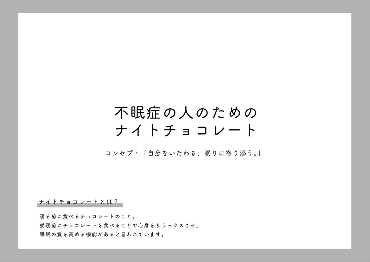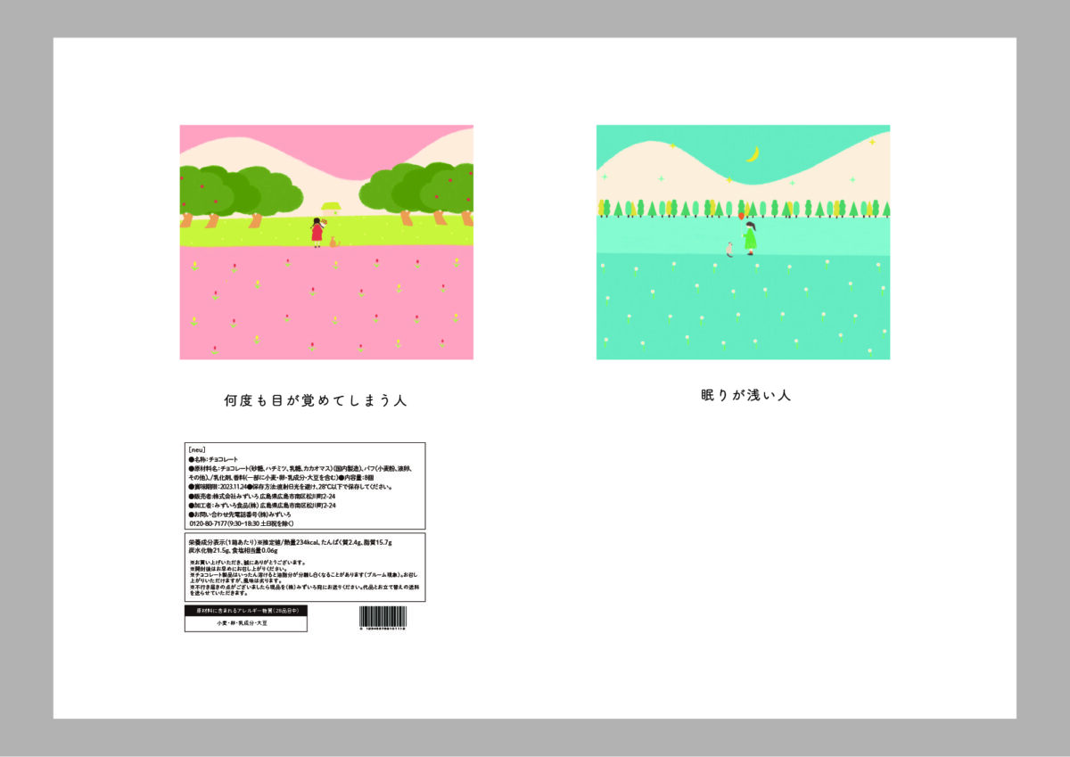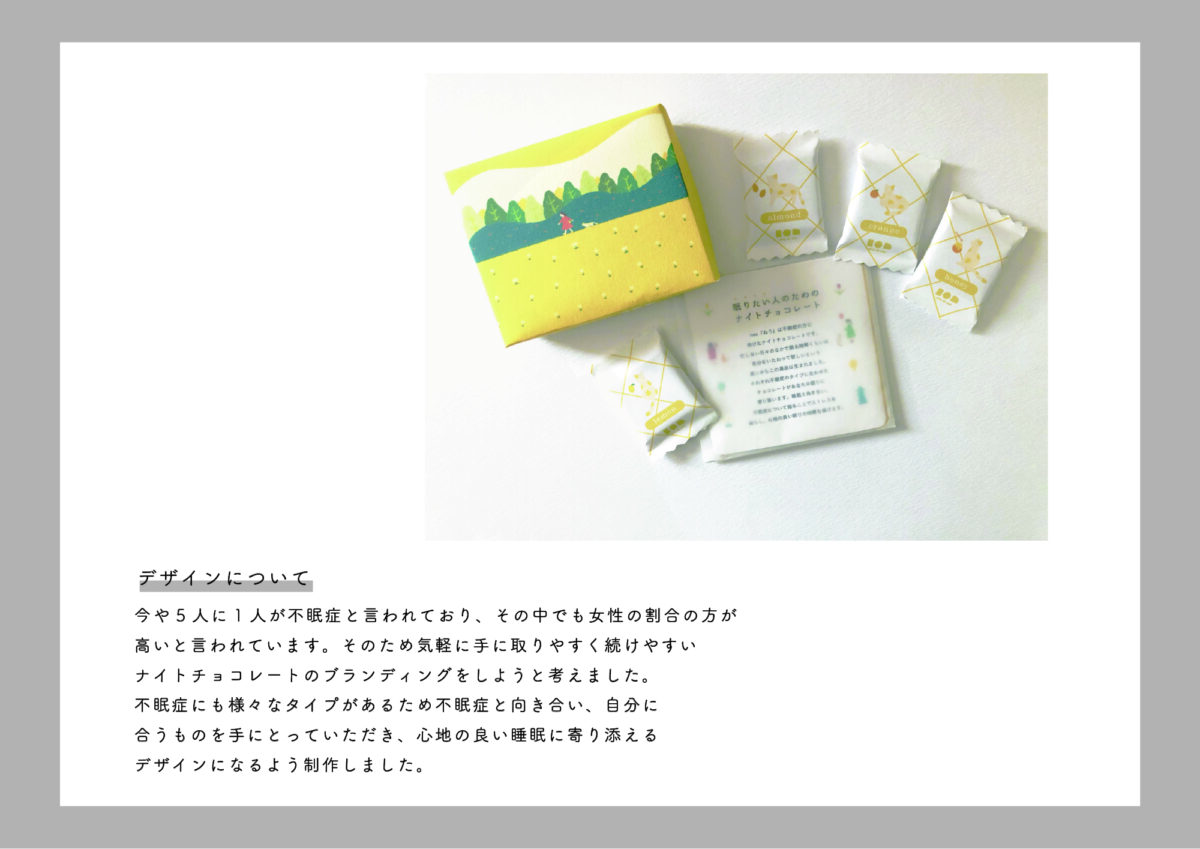 不眠症の方へ向けたナイトチョコレートのブランディングツールを制作しました。寝る前に食べるものなので絵本のような可愛らしいイラストを使用し、商品説明カードは裏返すとイラストが繋がるようになるなどターゲットである女性の手に取りやすいデザインにしています。不眠症のことを知ってもらえるような制作を心がけました。