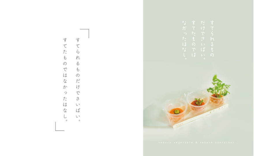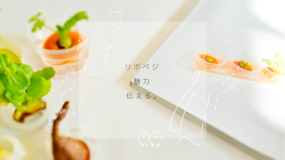 “リボベジ”とは、野菜の切れ端を水につけて野菜を再生・栽培するリボーンベジタブルの略です。リボベジには空き容器と野菜の切れ端があれば始められる手軽さと、捨てられる物だけでするのに愛らしく見えてしまうという魅力があります。卒業制作ではその魅力を伝えるためにInstagramに投稿することや、色々な空き容器でリボベジをしてみることなどの取り組みを行い、その取り組みをまとめるためのツールとして写真集を制作しました。写真集には“リボベジ”と“リボヨウキ”で「リボリボコレクション」というコーナーを作っており、野菜と容器の再び生かし合う関係性をより綺麗に魅せています。このコレクションを作るためにただの空き容器を使用するのではなく、空き容器を綺麗に作り直しています。空き容器の印象が綺麗な物に変わるかもしれない面白い世界観にも注目して頂けると嬉しいなと思います。