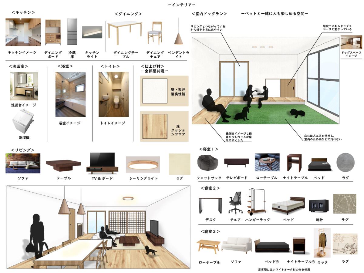 人にとってもペットにとっても住みやすく楽しく暮らせるワンダフルなお家をコンセプトに設計・提案しました。主に工夫した点は、階段下のスペースを活用してペットスペースにしたり、リビングから通じる室内ドッグランで天候・季節に関係なくペットが遊べる空間を設けたことです。その他にもペットが各寝室に行きやすいようにドアを引き戸にしたり、急な来客時にも対応できるように駐車場も広めにとるなどの工夫もしました。