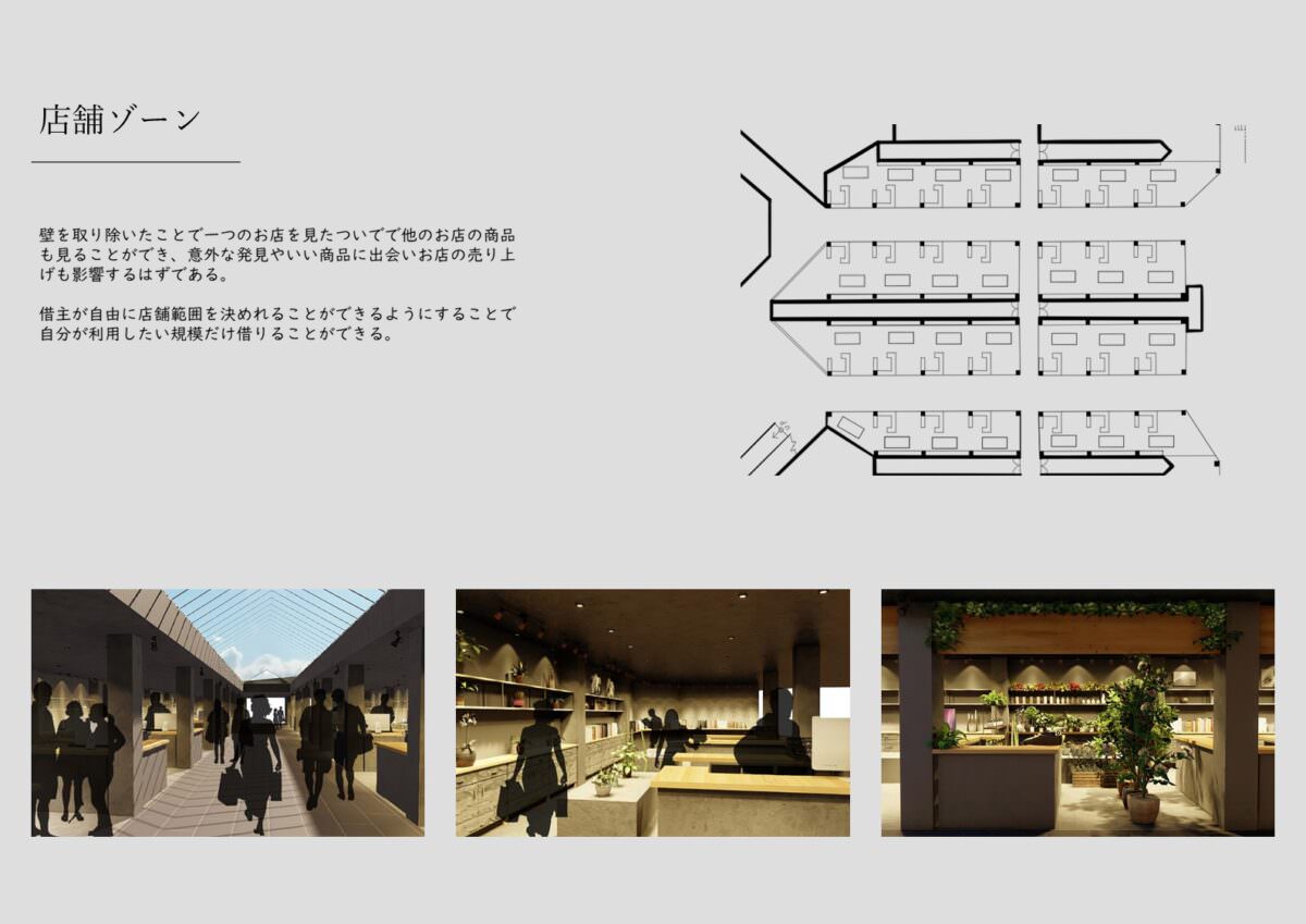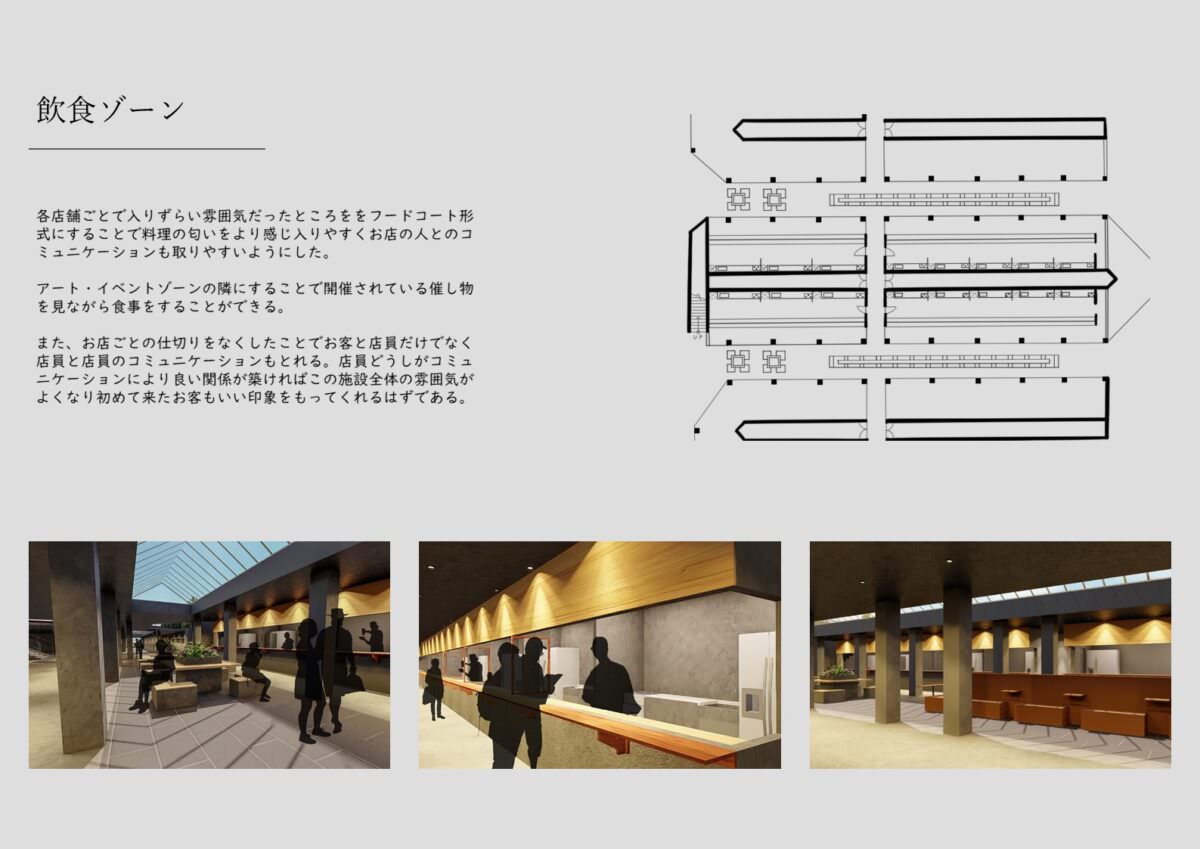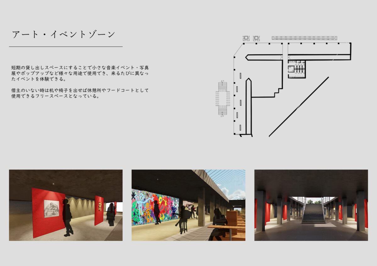 高齢化・限界集落化している基町団地の中心にある基町ショッピングセンターは現在シャッター街となっており、休日の昼間でも人通りが少なく重たい空気が漂っている。そこで、老若男女国籍を問わず交流できるものとして、アートをテーマに人々がつながりを持つことのできる施設への改装を提案する。
