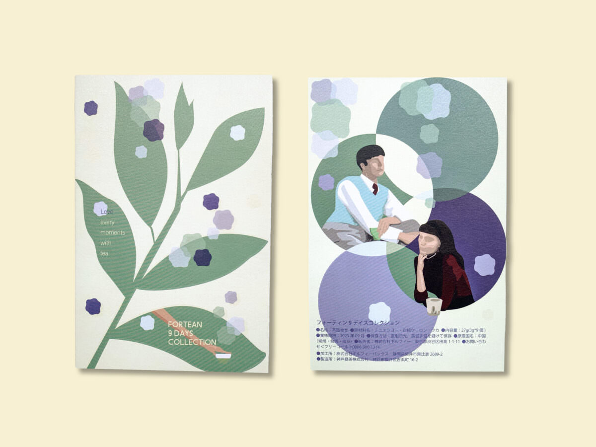 具体的には、祖父が生産する緑茶の販売ルートを広げるために、日本から来た観光客をターゲットにしました。そこで、実家茶を中心となる空想ブランド「fortean」を作りました。本とパッケージが同時に楽しめるように、外側には本型で、内側にはティーバッグがついてます。ミランダ紙と透明インクを使うことで、素材の質感を重視しています。ティーバッグを引くという動きで便利性を意識し、贅沢にティータイムを過ごせるギフトセットの制作を行いました。