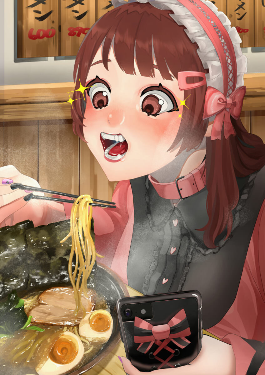 カロリーを気にせず可愛い女の子がラーメンを食べようとするイラストです。