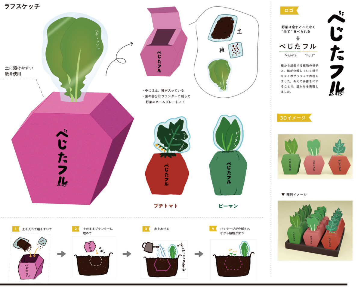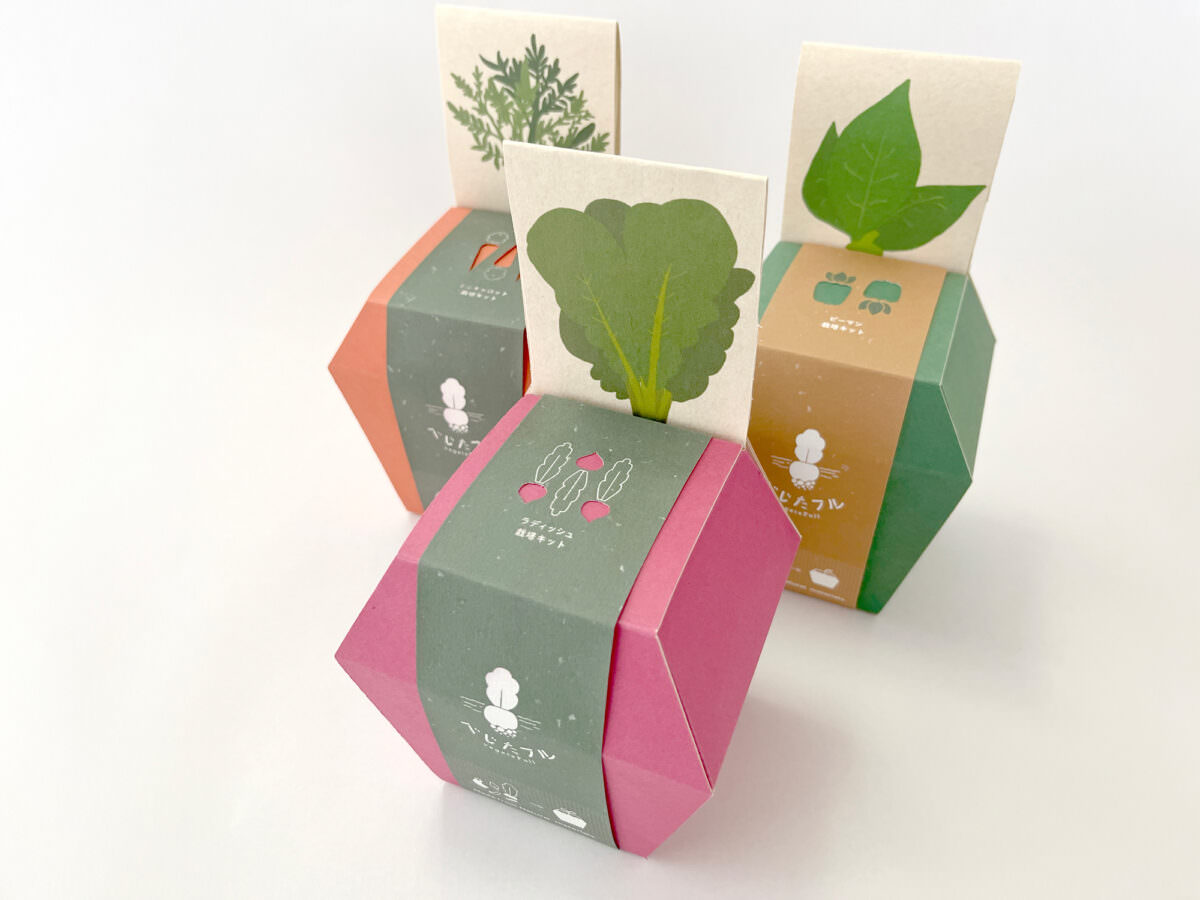 家庭菜園が簡単にできるキットのパッケージで、紙が土に分解される特製を活かして、セットの土や種と一緒にそのまま植えられることで野菜を余すことなく食べられることを表現しています。