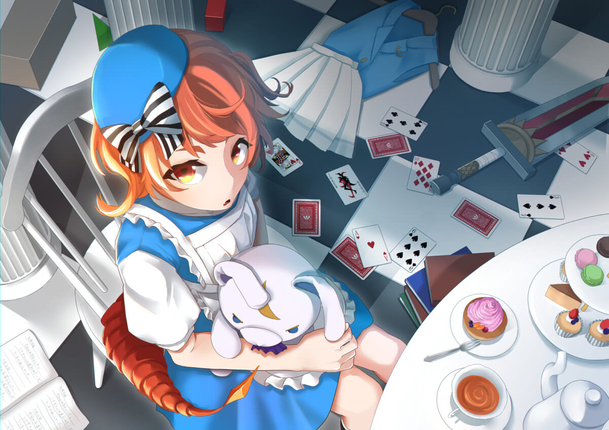 キャラクターを大きく見せつつ、背景も盛り込める構図にしました。また、キャラの元々の特徴とイベントのアリス要素のバランスに気を付けて制作しました。
