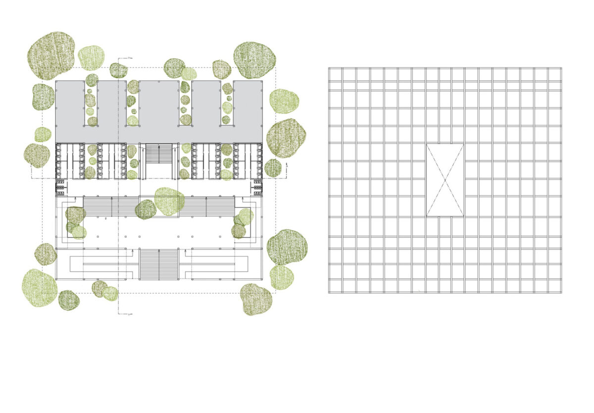 緑が飲み込む階段状の宿泊棟や、対面からの学び得る交流施設が、人と地域と自然を繋ぐ。