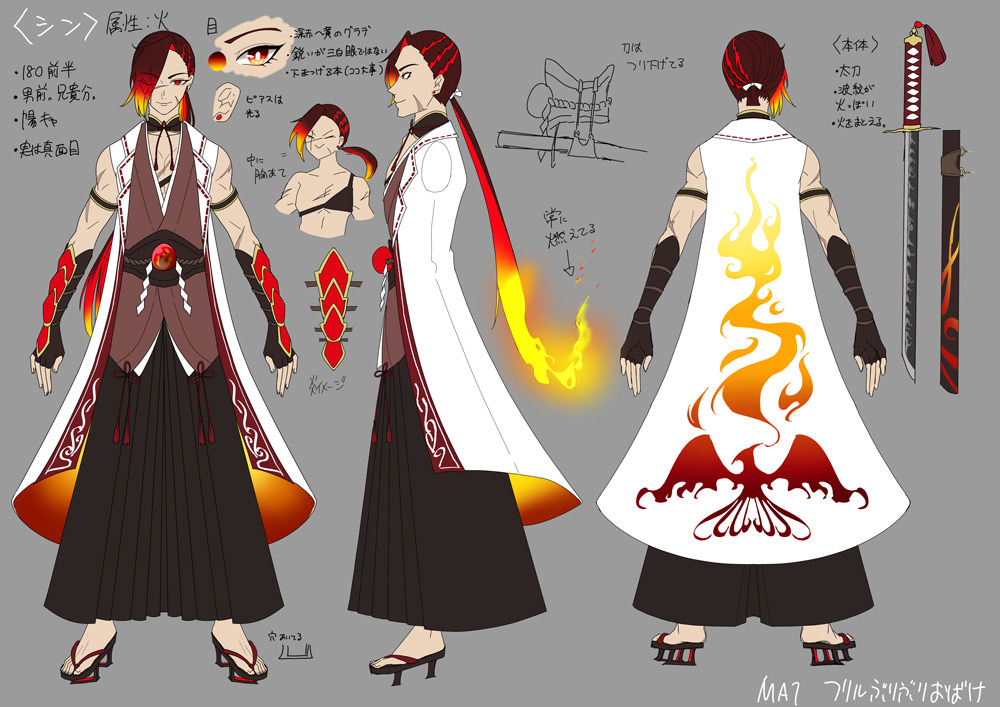 シン憑依の主人公は、ベースを主人公に、シンのカラーや燃え盛る髪の毛などを取り入れました。性格もその憑依する属性によってコロコロと変わるのも面白いと思いました。また、憑依中は姿はなくとも付喪神が耳飾りから話しかけてくるのも良いと思いました。
