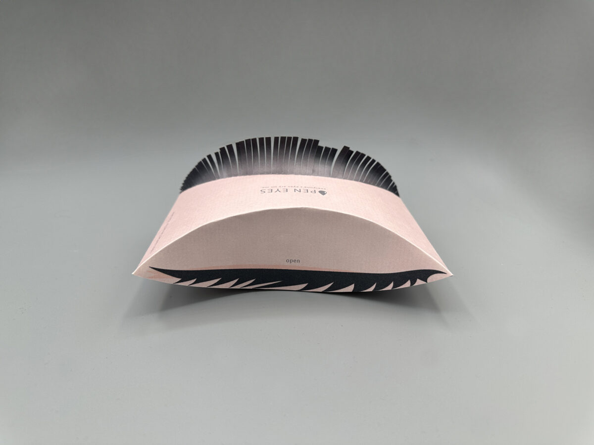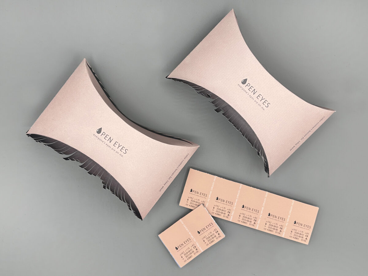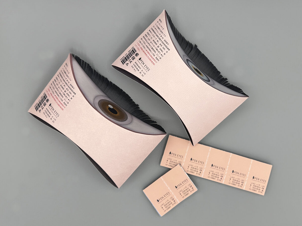 ピローボックスという、これも定番の箱(パッケージ)の形態を目の形に見立てています。