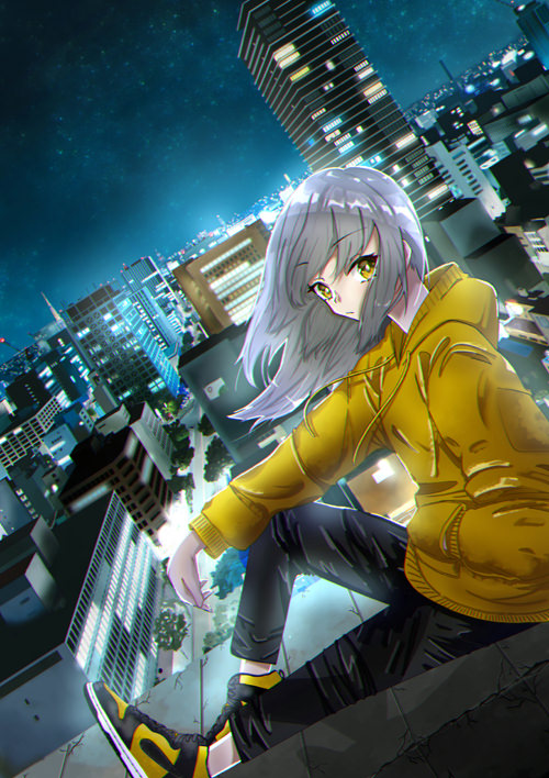 ビルの屋上で待ち合わせをしているイラストを描きました。
