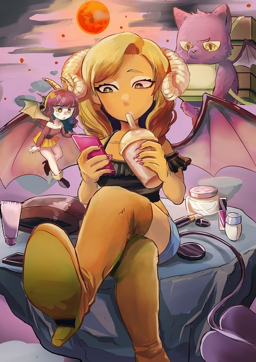 魔界にいる悪魔が友人と使い魔と話をしているという絵です