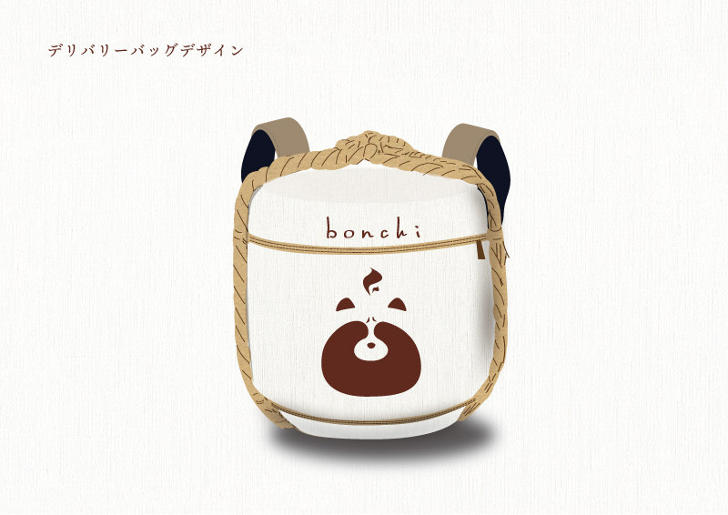 ロゴは西条の逸話に出てくる狸をベースに顔は西条の大半をしめる盆地の形と酒蔵の煙突、耳と鼻には実際にも位置している山を取り入れ、西条の風景をイメージして制作しました。店舗イメージは、コーヒースタンドから着想を得たものに酒蔵通りのイメージをプラスする事で新しくも街並みに馴染むようデザインしました。デリバリーバッグは、お酒の町に酒樽を背負った配達員がいたら目立って宣伝になり、観光地としても面白いのでは!?と思い取り入れてみました。ショッパーバッグには狸の尻尾をデザイン、人に贈り物をする時、相手の気持ちを動かしたい、そんなことを考えた時、狸が人を化かす時と同じ顔かもというアイデアからバッグを後ろに隠すポーズを取った時の後ろ姿は尻尾が生えて見えるようデザインしました。
