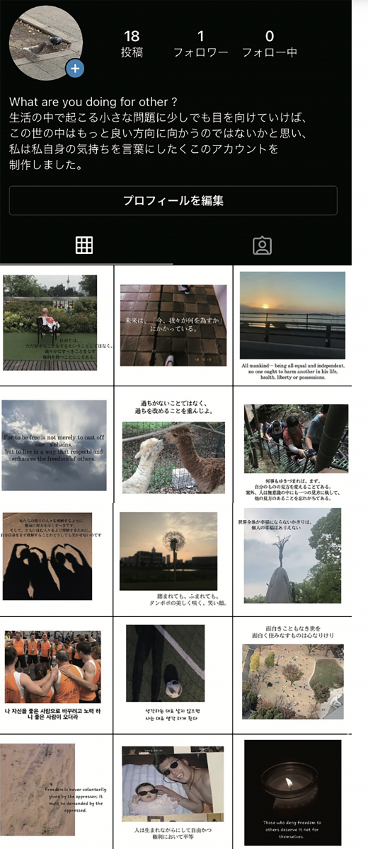 演説や歴史人物の名言を集め、それらを写真と組み合わせ若者がよく使うInstagramに投稿しました。世界で起きている出来事に目を向けて欲しく制作しました。